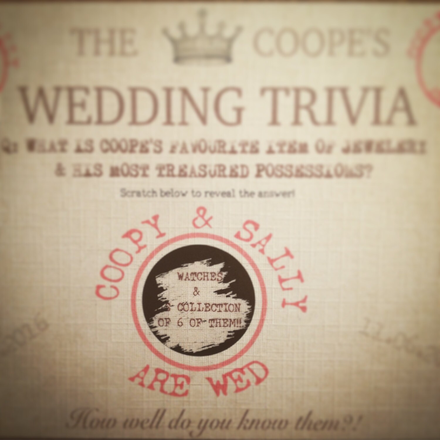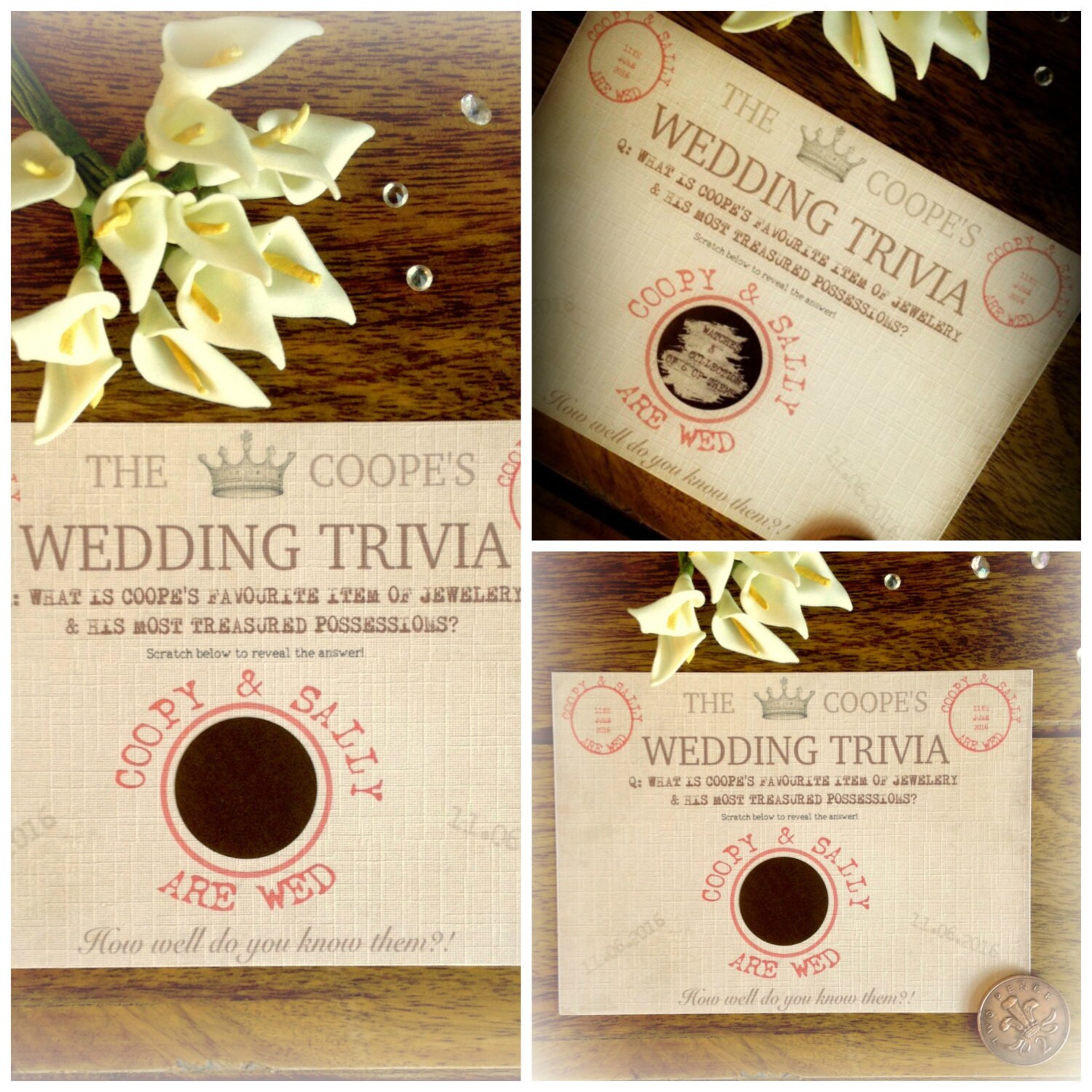 Trivia card itself is A6 (can be amended to your own choice of dimension) and is printed on luxury 300gsm Linen Cardstock with a gold scratch label.