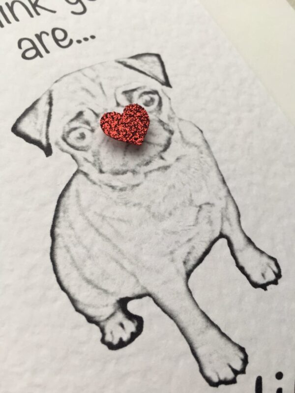 A humorous Valentine’s Card for all those Pug Lovers out there featuring our beautiful Bubble the Puggle again with her cute raised glitter heart nose.