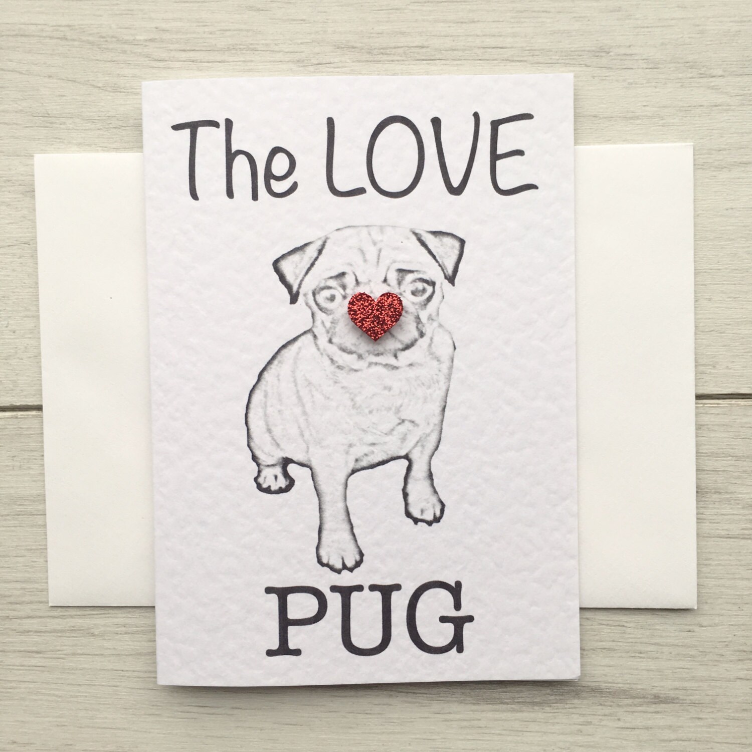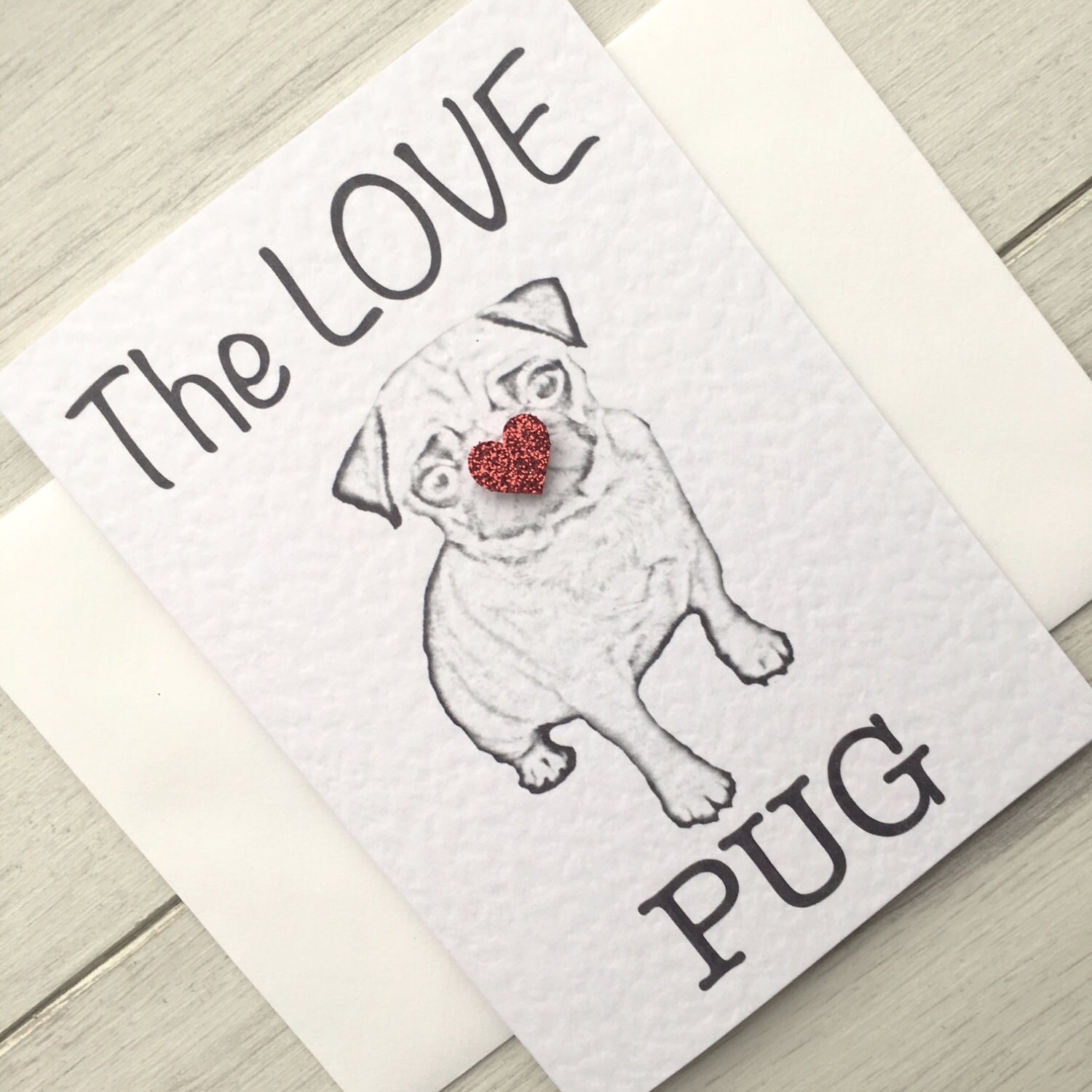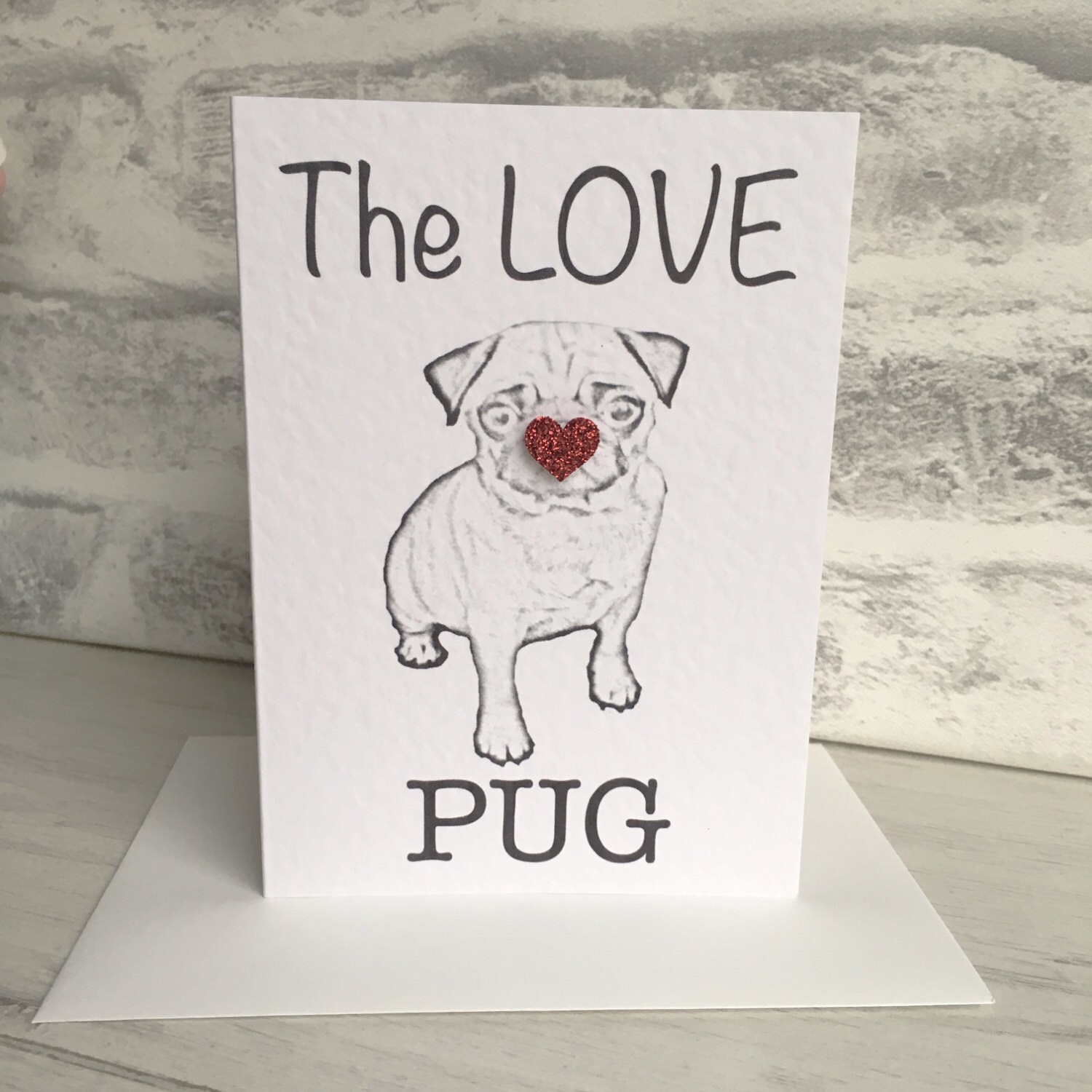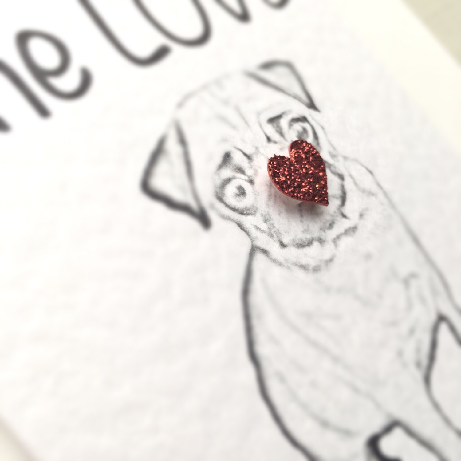 A humorous Valentine’s Card for all those Pug Lovers out there featuring our beautiful Bubble the Puggle again with her cute raised glitter heart nose.